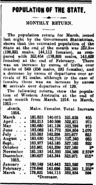 At the end of July 1914 the population of Western Australia was 325,677, of which 183,383 (56.3%) were males, and females 142,294 (43.7%).There was a much higher percentage of males to females in Western Australia compared to the national average. (See image at right - WA Population 12 mths to Mar. 1915 (Knibbs) - Argus Newspaper 5 Nov. 1915 - Trove )