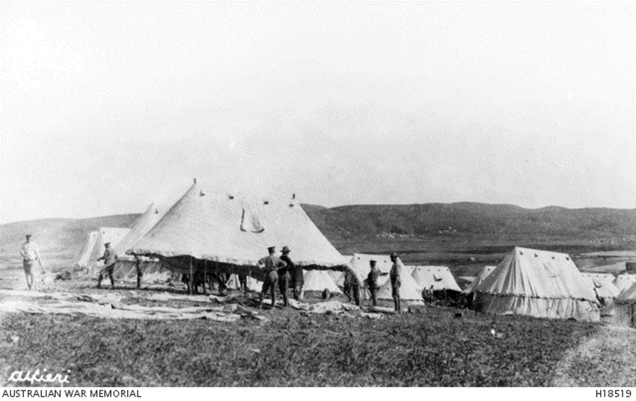 The No. 2 Australian Stationary Hospital was originally located at Mena Camp in Egypt and moved to Mudros, Lemnos in June 1915. Lemnos was being developed as an intermediate military medical base and No. 2 A.S.H. became part of it. By August there were 763 patients and by October there were sixty large marquee-tents, 1200 beds and 25 nursing sisters. No. 2 A.S.H. left Lemnos for Egypt in January 1916 following evacuation of the Peninsula.