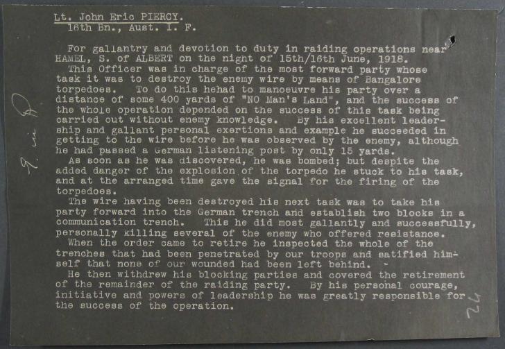 He was further wounded suffering a gun shot to the right knee in August 1918. Piercy remained in England until early 1919 and returned to Australia after his service with the A.I.F. was terminated in May 1919.