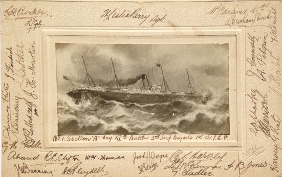 At the end of October 1914, Harvey’s battalion left the camp at Blackboy Hill and travelled by train to Fremantle where they boarded the troopships Ascanius and Medic. Harvey’s company went aboard the Medic and he and others in his section signed a photograph of the ship which he later brought home.