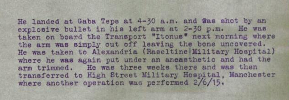 After this, I was with the platoon, although we got rather mixed up with N.Z.’s and others, till I got shot with an explosive bullet in the left upper arm about 2 o’clock in the afternoon. As things were very lively I had to lie under cover till 8 p.m., when some of the boys come back just in the nick of time to save me from being nabbed by the Turks, who were actually on me when some New Zealanders arrived.