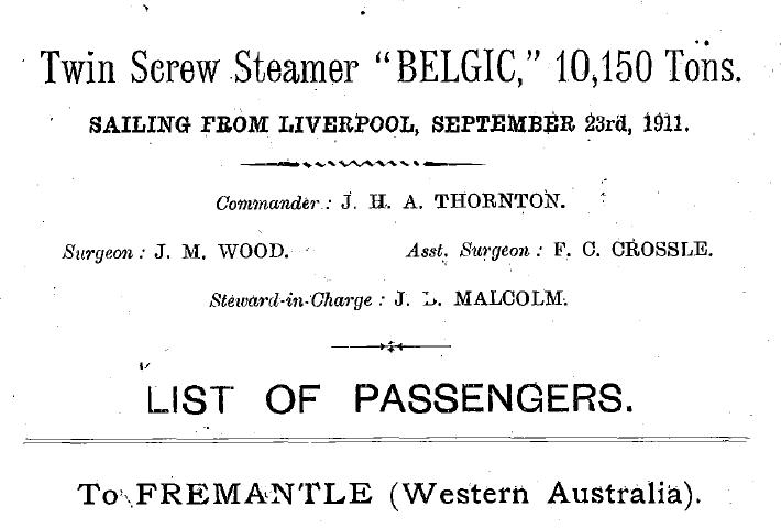 TSS Belgic - Arrived Fremantle 11 November 1911 - Passenger List