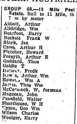 Settlers were to work in groups of 20 developing the land and later each would take over a farm when it was fully prepared. Groups were established in the Manjimup district, followed by others at Denmark, Northcliffe, etc. as well as on the Peel Harvey Estuary south of the State’s capital, Perth.