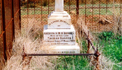 Rest Place: Ashburton Downs Station, Balbinya Station, Beejenup Gnowangerup, Bonny Downs Station, Bootenal, Bowes Estate Northampton, Broad Arrow Kurawah Cemetery, Cygnet Bay, Ellensbrook Margaret River, Erlistoun Cemetery, Flora Valley Station, Gullewa Cemetery, Karridale Pioneer Cemetery, Karridale Timber Mill, Mahogany Inn, Mt Brown Beaufort River, Mt Ida Cemetery, Mt Jackson Station Yilgarn, Mt Newman Cemetery, Mt Ommanney Northam, Murchison House Station, Old Halls Creek Cemetery, Nanine Cemetery, Tardun, Upper Capel, Woodman Point, Wurarga Dam