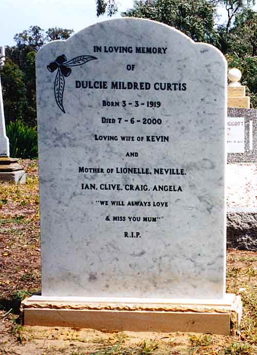 Resting Places:  Broad Arrow Kurawah Cemetery, Goongarrie Cemetery, Karridale Pioneer Cemetery, Onslow Pioneer Cemetery, Pintharuka Cemetery Morawa, Springhill Private Cemetery Bunbury, Tambrey Station Ashburton