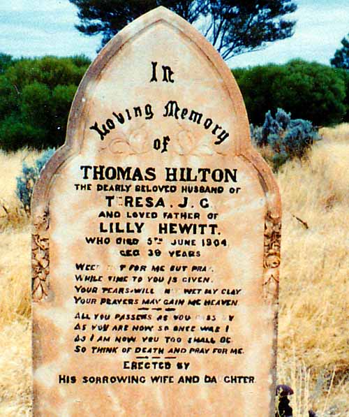Rest Places: 81-Mile Albany Highway north of Williams, Beaufort River, Broad Arrow Kurawah Cemetery, Broome Pioneer Cemetery, Condon Cemetery, Corrigin Cemetery, Fields Find Cemetery, Glentromie Cemetery, Grants Patch, Hester Street Langford, Israelite Bay, Karridale Pioneer Cemetery, Lennonville Cemetery Mt Magnet, Mt Newman Cemetery, Mulwarrie, Newleyin Northam, Old Popanyinning Cemetery, Onslow Pioneer Cemetery, Wanarra Station Perenjorie